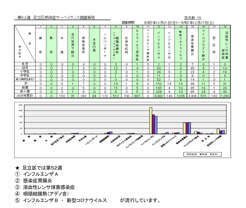 調査期間 2025年12月21日(日) ~ 2025年12月27日(土) ※高校生は「成人」に含まれます。 ★区立小・中学校のインフルエンザ対応状況 (足立区公式HP) 足立区感染症サーベイランス 足立区感染症情報 感染症情報 保険情報
