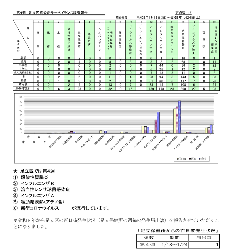 調査期間 2026年1月18日(日) ~ 2026年1月24日(土) ※高校生は「成人」に含まれます。 ★区立小・中学校のインフルエンザ対応状況 (足立区公式HP) 足立区感染症サーベイランス 足立区感染症情報 感染症情報 保険情報