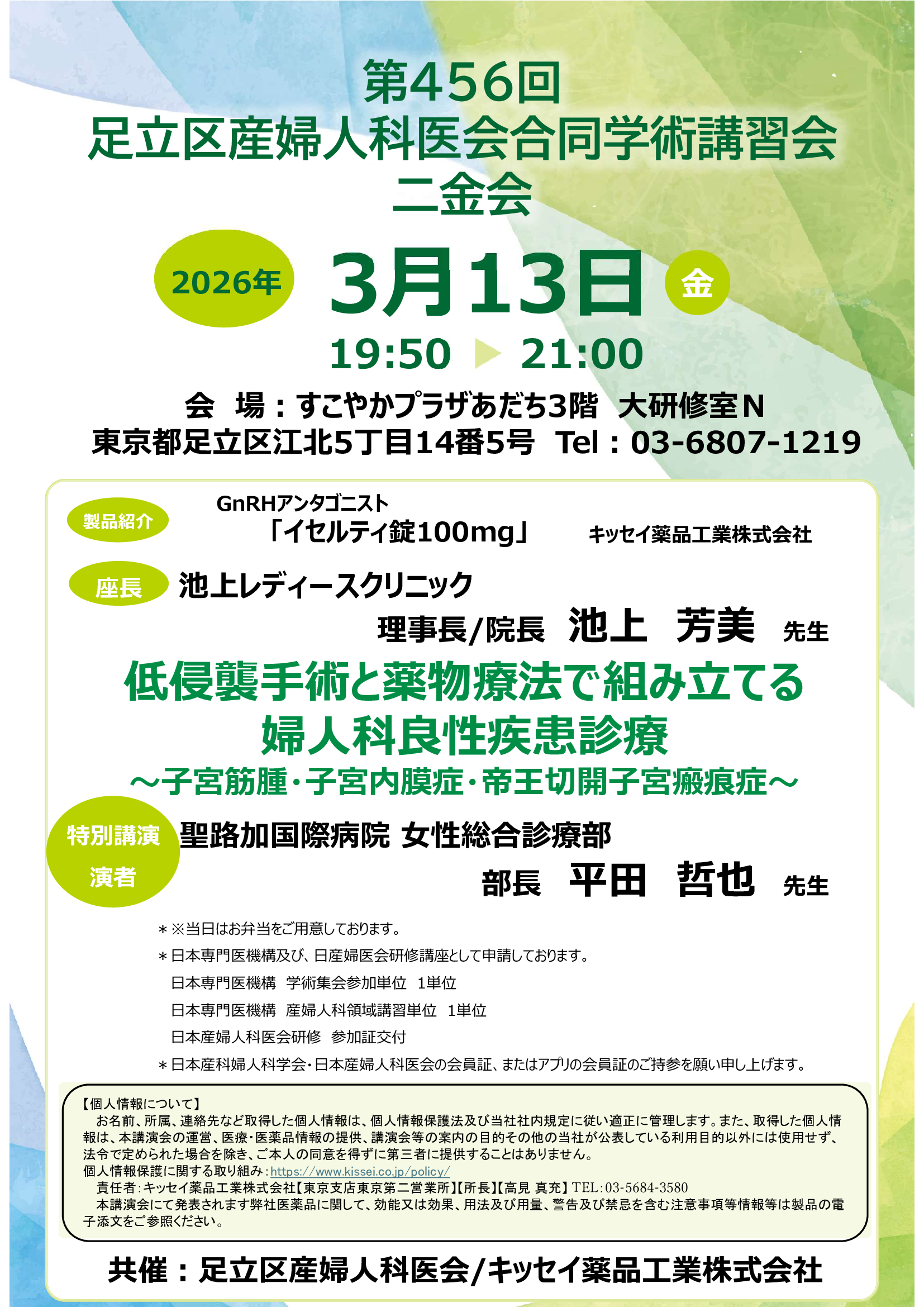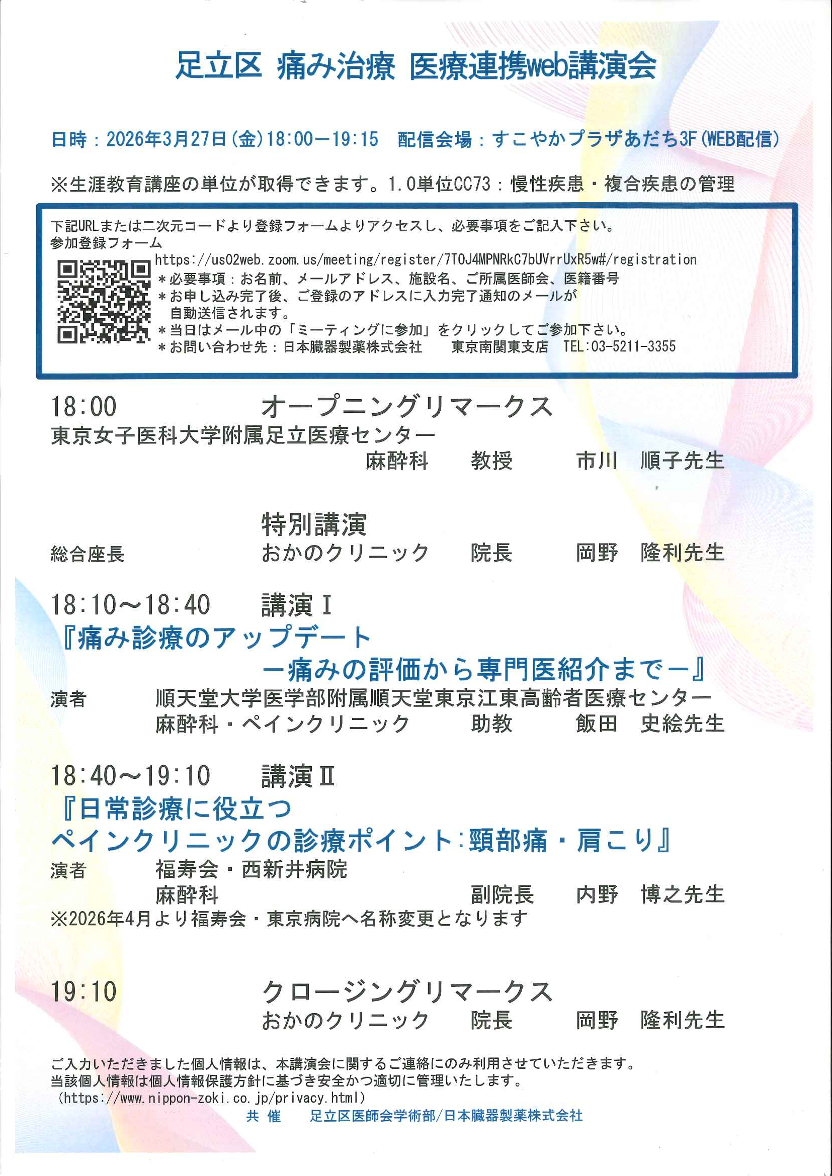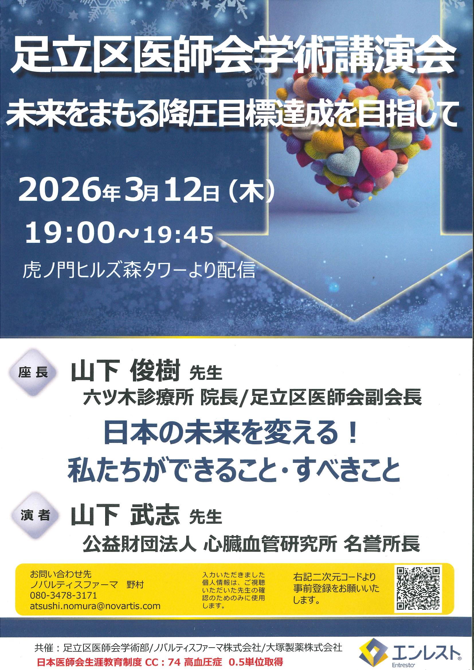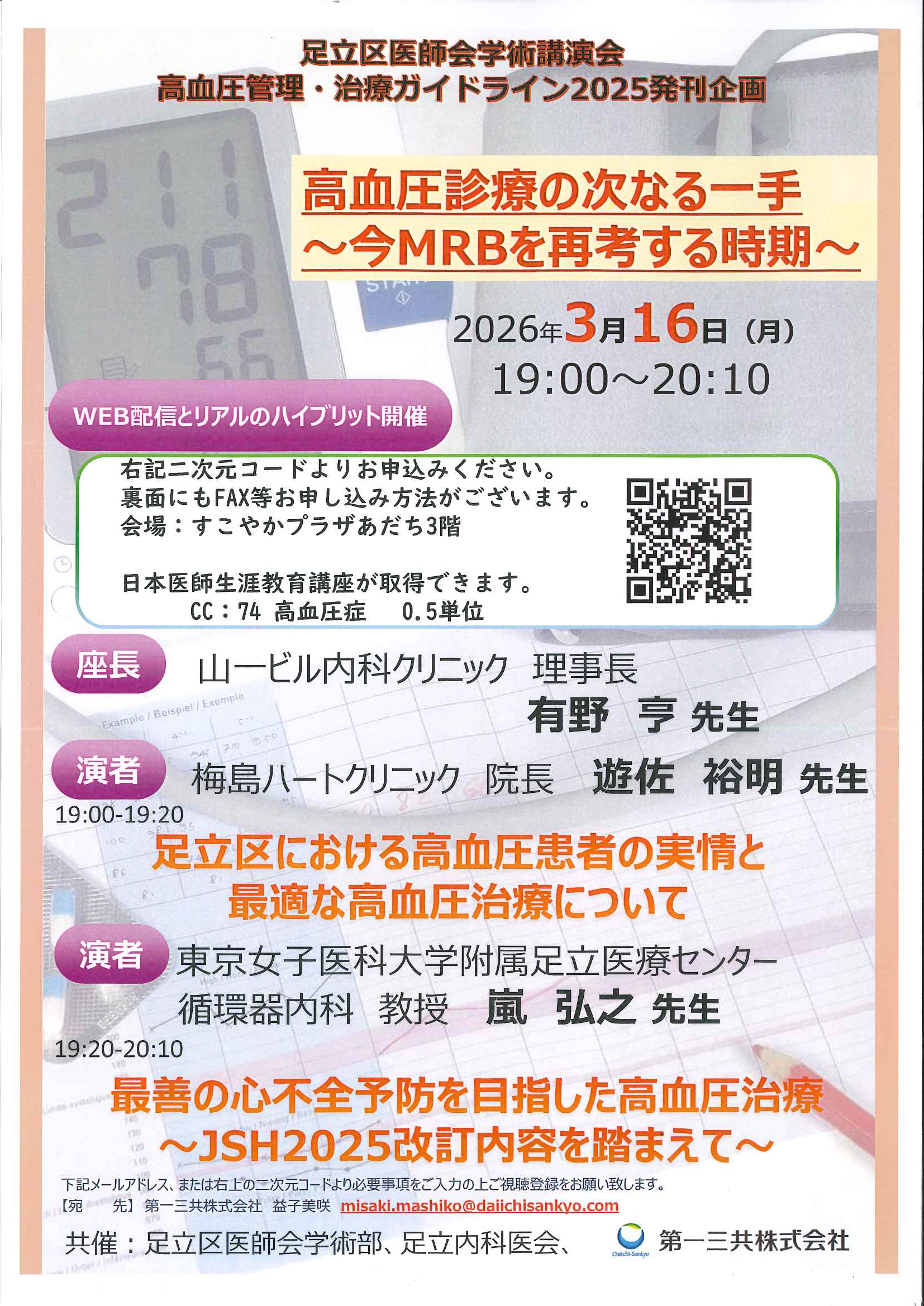 令和7年度認知症検診講習会 日時:2月27日(金)19:00 場所:すこやかプラザあだち/オンライン 足立区医師会学術講演 未来をまもる降圧目標達成を目指して 日時:3月12日(木)19:00 場所:オンライン 第456回足立区産婦人科医会合同学術講習会 日時:3月13日(金)19:50 場所:すこやかプラザあだち 足立区医師会学術講演会 日時:3月16日(月)19:00 場所:すこやかプラザあだち/オンライン NEXT heart-FULL seminar in ADACHI 日時:3月25日(水)19:30 場所:オンライン 足立区医師会予防接種学術講演会 日時:3月26日(木)19:30~ 場所:すこやかプラザあだち/オンライン 足立区痛み治療 医療連携Web講演会 日時:3月27日(金)18:00~ 場所:オンライン