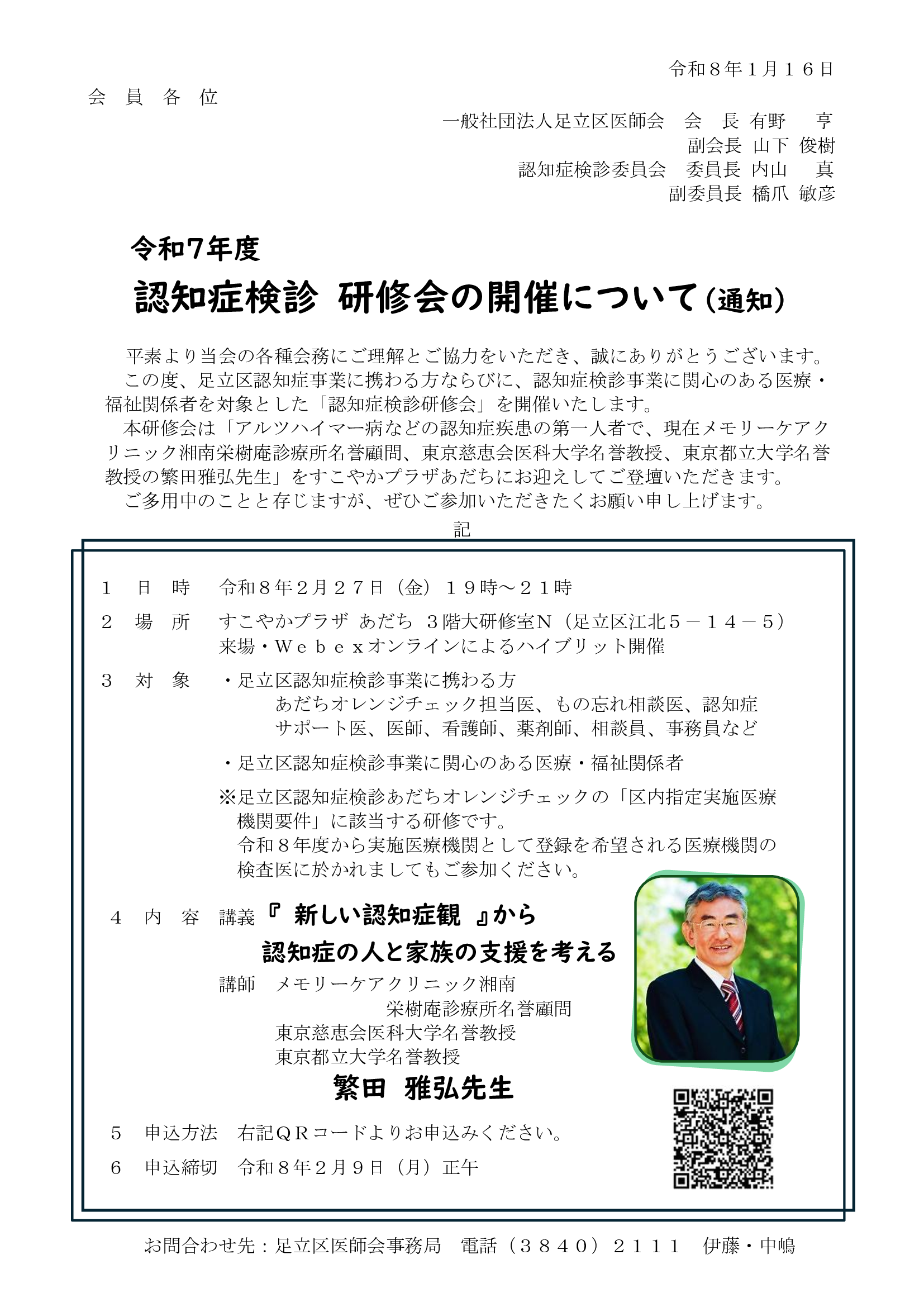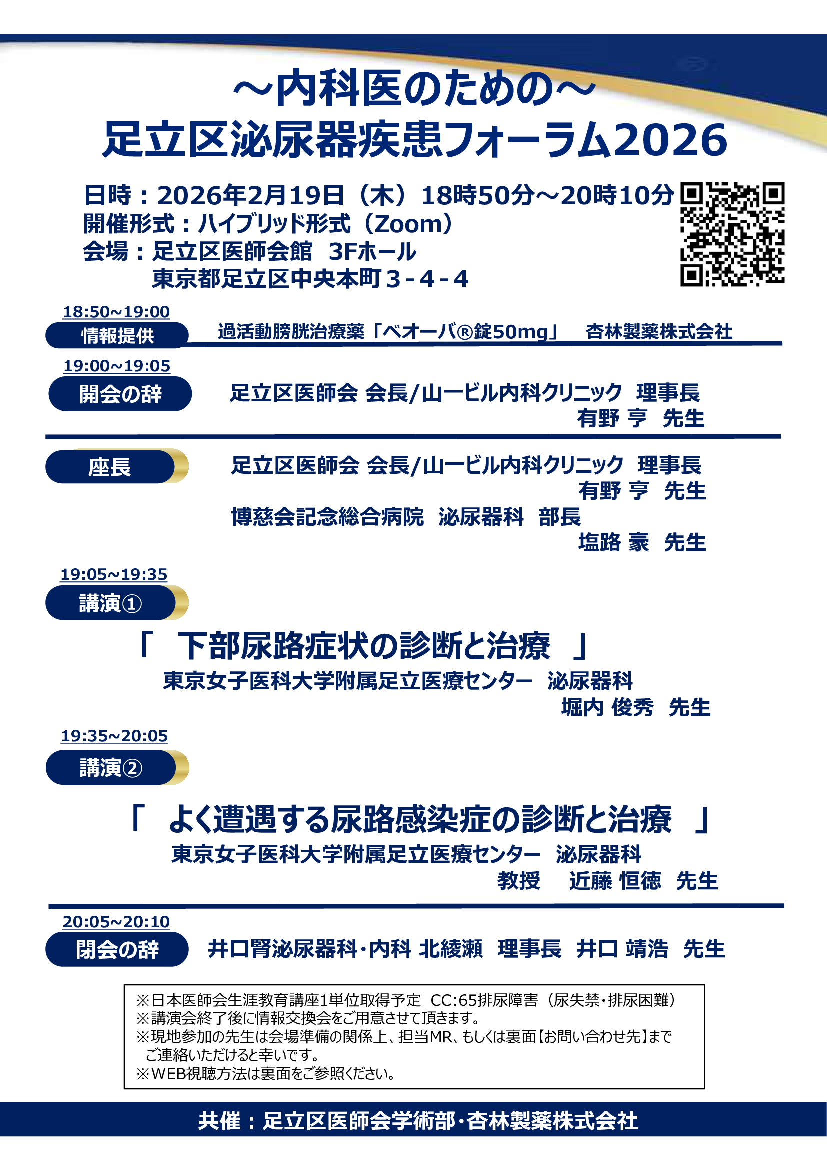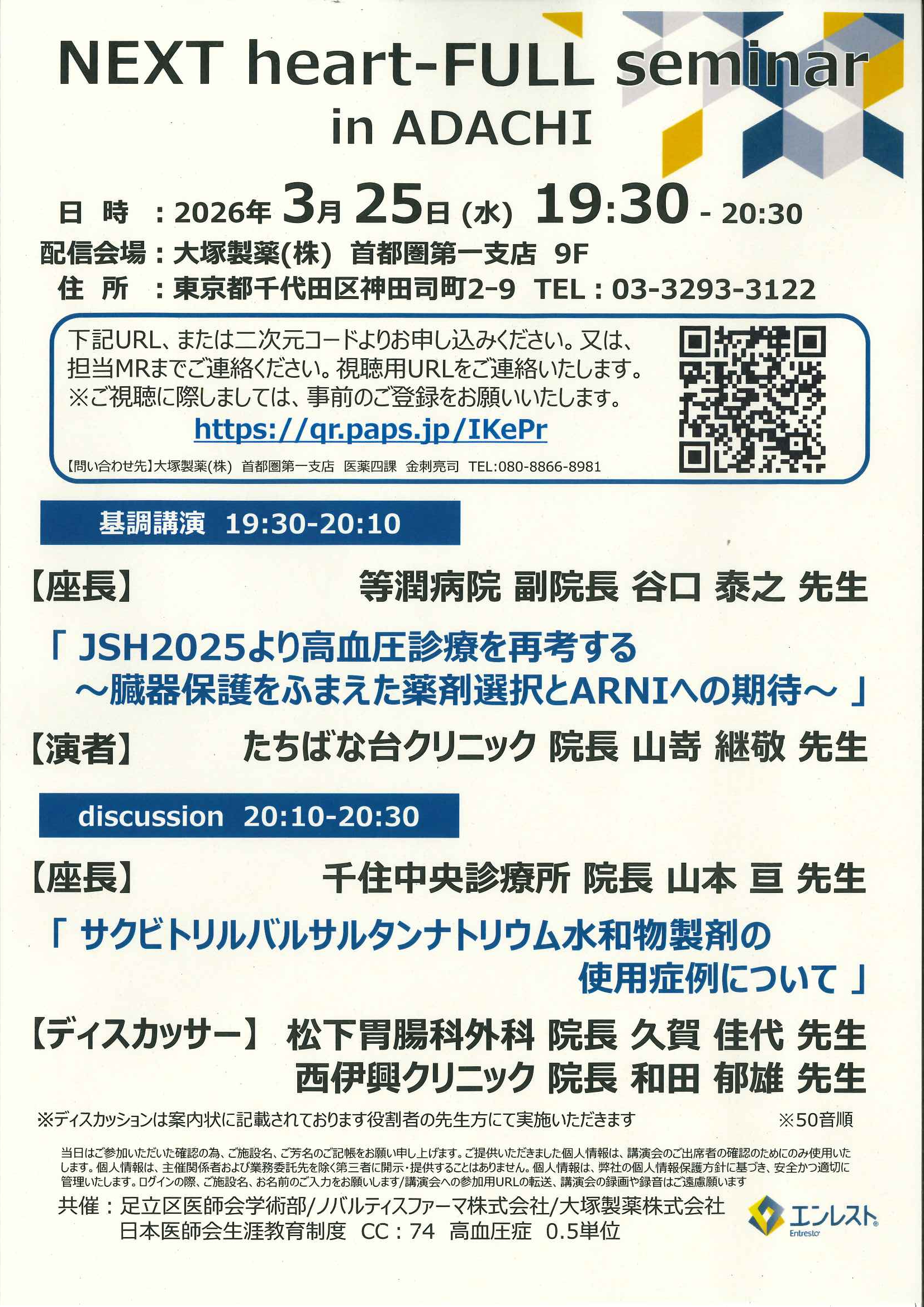 高血圧管理・治療ガイドライン2025発刊企画 日時:2月4日(水)19:00 場所:すこやかプラザあだち3階/オンライン ~パーキンソン病患者さんを見過ごさないために~ 日時:2月18日(水)19:30 場所:足立区医師会館3階/オンライン ~内科医のための~足立区泌尿器疾患フォーラム2026 日時:2月19日(木)18:50 場所:足立区医師会館3階/オンライン 令和7年度認知症検診講習会 日時:2月27日(金)19:00 場所:すこやかプラザあだち/オンライン 第456回足立区産婦人科医会合同学術講習会 日時:3月13日(金)19:50 場所:すこやかプラザあだち NEXT heart-FULL seminar in ADACHI 日時:3月25日(水)19:30 場所:オンライン