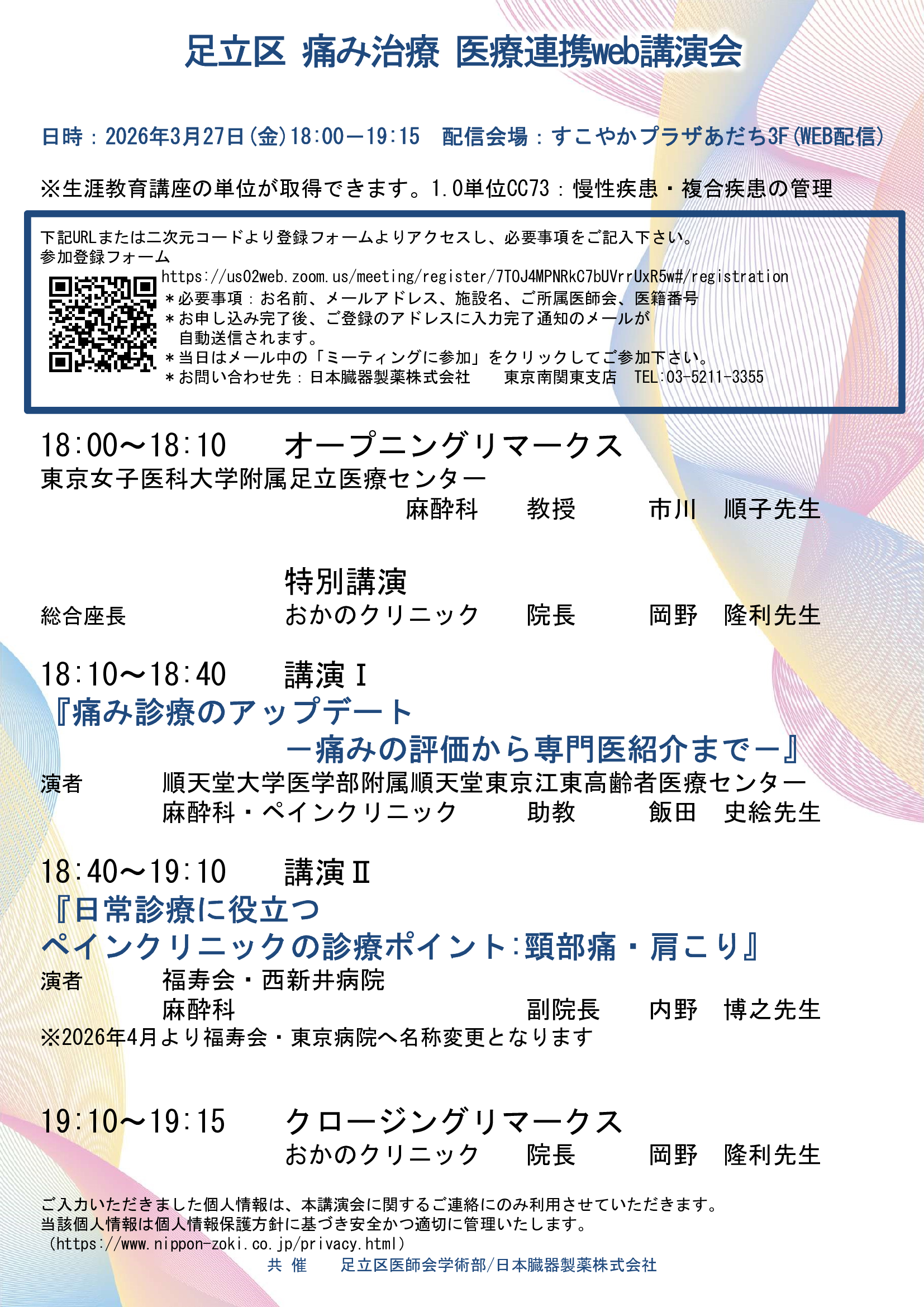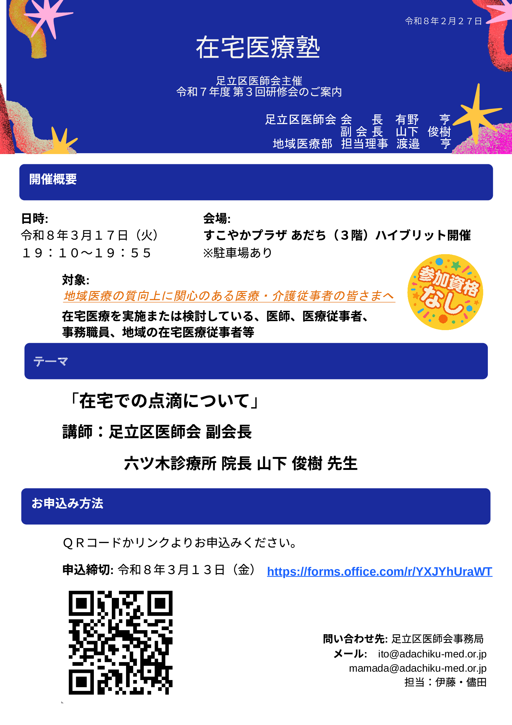 令和7年度第3回在宅医療塾研修会 日時:3月17日(火)19:10 場所:すこやかプラザあだち/オンライン NEXT heart-FULL seminar in ADACHI 日時:3月25日(水)19:30 場所:オンライン 足立区医師会予防接種学術講演会 日時:3月26日(木)19:30 場所:すこやかプラザあだち/オンライン 足立区痛み治療 医療連携Web講演会 日時:3月27日(金)18:00 場所:オンライン ミライマモルプロジェクト~inAdachi~ 日時:4月7日(火)19:30 場所:オンライン